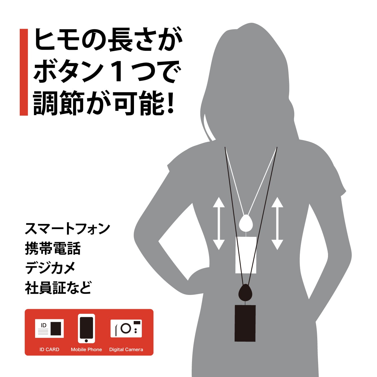 ボタンひとつで紐部分(ストラップ)の長さを自由に調整・固定することができ、必要な時だけ、必要な長さに調整できる使い勝手の良さが特徴。